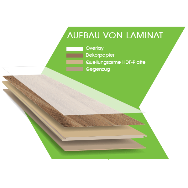 Die oberste Schicht des Laminatbodens ist die Verschleißschicht, auch Overlay genannt. Diese Schicht besteht aus einer robusten, transparenten Melaminharzbeschichtung, die den Boden vor Abnutzung, Kratzern und Flecken schützt. Dank dieser Schutzschicht behält der Laminatboden auch bei intensiver Nutzung sein schönes Aussehen. Darunter befindet sich die Dekorschicht. Diese Schicht enthält ein hochwertiges Fotodruckmuster, das den natürlichen Look von Holz, Stein oder Fliesen nachahmt. Dank modernster Drucktechnologien wirkt das Dekor täuschend echt und verleiht Ihrem Raum eine ansprechende Ästhetik. Die nächste Schicht ist die Trägerschicht, die dem Laminatboden Stabilität verleiht. Diese Schicht besteht aus hochverdichteten Faserplatten (HDF), die dafür sorgt, dass der Boden besonders stabil ist. Die unterste Schicht besteht aus einem Gegenzug, der Verformungen verhindert.